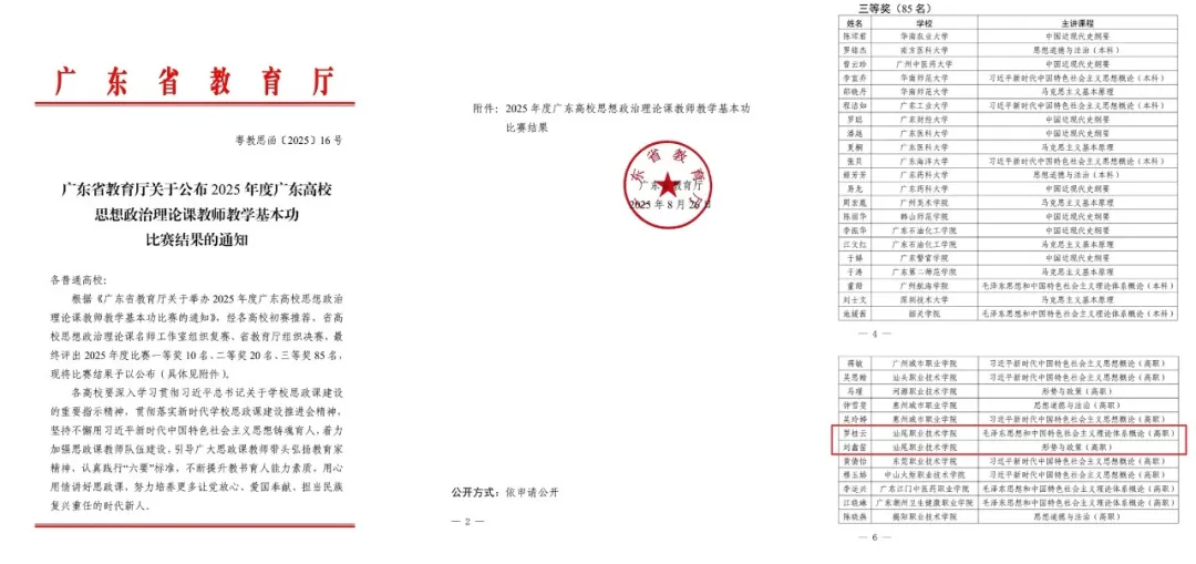 近日,广东省教育厅公布 2025 年度广东高校思想政治理论课教师教学基本功比赛获奖名单,公司bevictor伟德体育罗桂云老师获《毛泽东思想和中国特色社会主义理论体系概论》课程高职组三等奖,刘鑫笛老师获《形势与政策》课程高职组三等奖,实现了公司此项赛事成绩历史性突破。